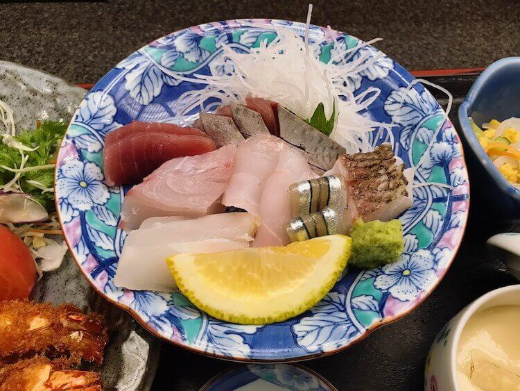 お造りの方は、首折れサバ、あかじょう(スジアラ=アカジンミーバイ)、目鯛、きび(きびなご)、まぐろ、など7種の刺身!